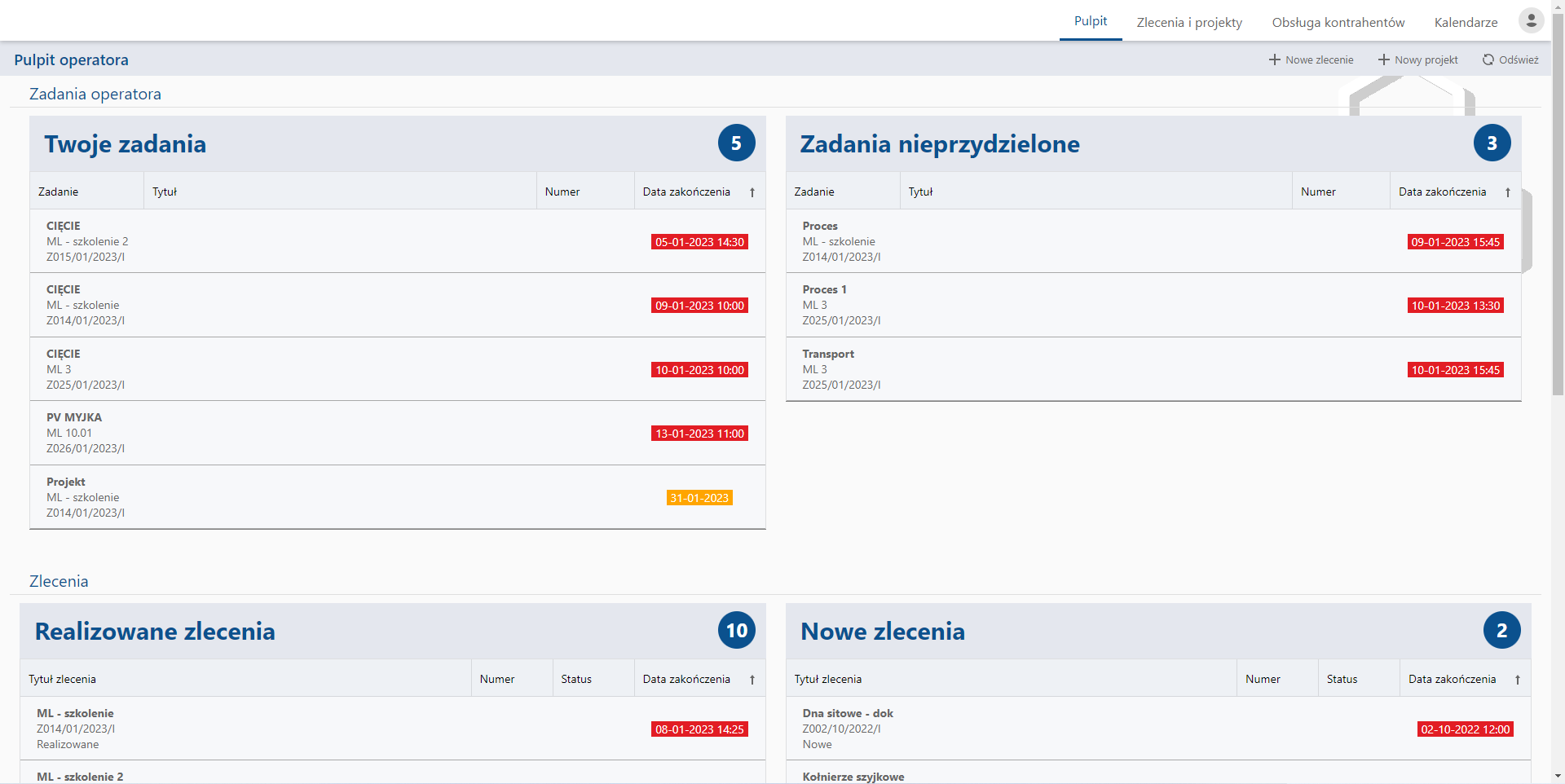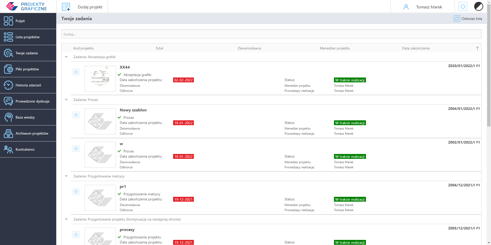 - Możliwość dodania kontrahentów do procesu realizacji zleceń / projektów poprzez nadanie im możliwości dodawania zamówień, akceptacji wybranych etapów realizacji zlecenia, dodawania plików